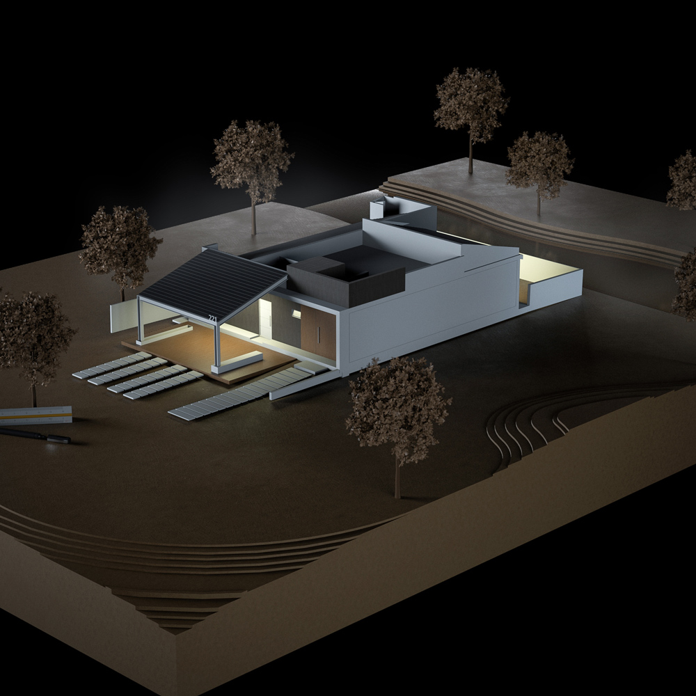 Al frente la cochera, área de almacenamiento y servicio, para dar privacidad desde el frente (calle). Desde el acceso principal llegamos a un espacio abierto, integrando sala-comedor-cocina, que a su vez se conectan mediante un ventanal de cinco metros a la terraza en la parte trasera, está diseñado como un área para reuniones familiares o de amigos que está separada del área privada y ofrece espacio para cocinar, comer o descansar. Al mismo tiempo, participa en un área al aire libre que es claramente diferente del resto de la casa, con vista al arroyo y la vegetación que lo rodea.